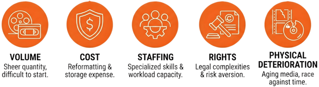 - Volume. The sheer quantity of audiovisual material makes it difficult to know where to start, and directly connects to cost concerns for reformatting and digital storage.